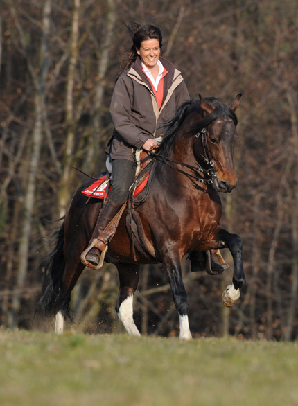 Durch ihre Anstellung auf einem Gangpferdegestüt lernte sie die Mangalarga Marchadores kennen. Neben anderen iberischen Pferderassen wurden diese Pferde zu ihrer Passion. Mit ihrem Partner im Pferdebereich – dem Trainer in klassischer Dressur, Dieter Mader (www.klassich-iberisch.de). – begann sie Wochenendkurse in klassischer Dressur zu geben und startete 2010 das „Vitrine Projekt“ (www.vitrine-do-marchador.com) : nämlich fünf Hengste dieser Rasse in der Dressur auszubilden, auf europäischen Messen vorzustellen und Testreiten durchzuführen.