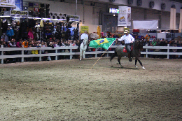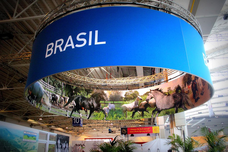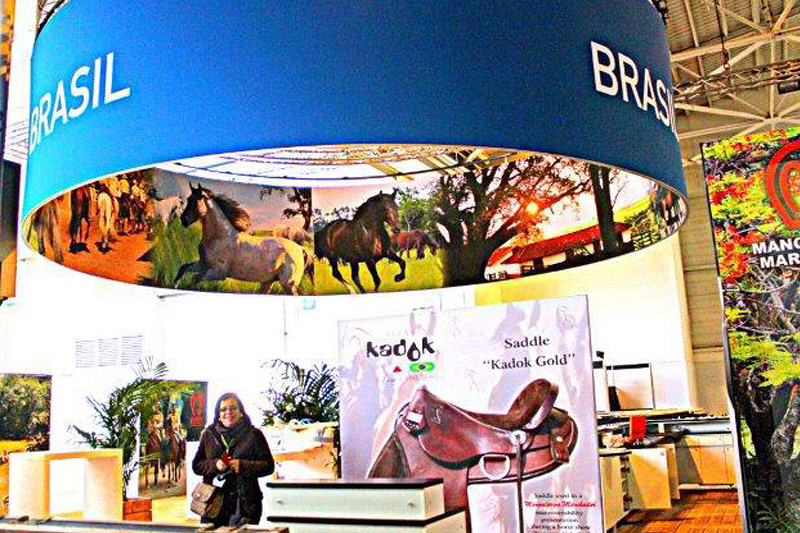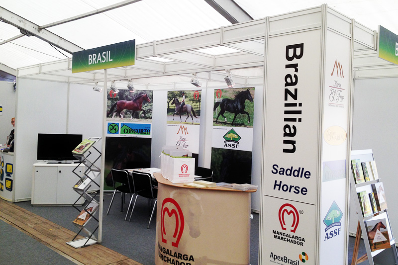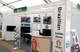 For the first time the vitrine stallions were presented and the project "Brazilian Saddle Horse" was shown in an attractive stand close to the presentation ring. The booth of the "Brazilian Saddle Horse" was 18 sqm big and at a corner directly situated at the presentation ring of hall 21. Every supporting breeder was presented with his haras logo, his brochure and DVD and the vitrine stallion(s) from the haras: